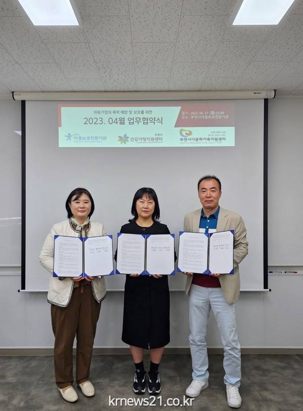부천시다문화가족지원센터(센터장 오욱제)와 부천시건강가정지원센터(센터장 신승희), 부천시아동보호전문기관(관장 홍현정)은 4월 17일 업무 협약식을 진행했다.