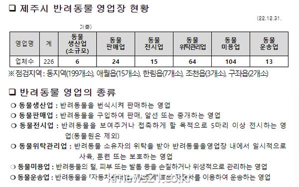 ▲ 사진=제주시제주시는 반려동물 영업장 사고를 미연에 방지하고 건전한 반려동물 영업 질서 확립을 위해 6월 30일까지 일제점검을 실시한다.