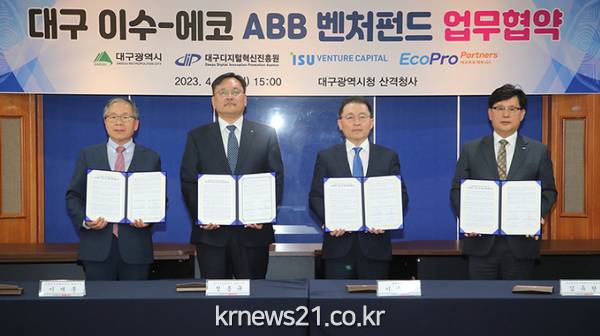 ▲ 사진=대구광역시대구광역시는 4월 17(월), 산격동 청사에서 이수창업투자, 에코프로파트너스, 대구디지털혁신진흥원과 함께 대구 ABB산업 육성을 위한 ‘ABB 벤처펀드 조성·운용’ 업무 협약식을 개최했다.