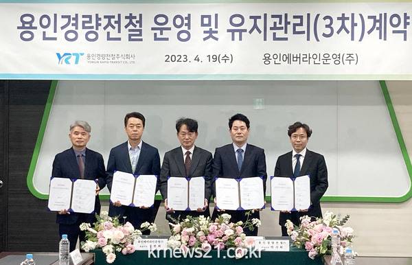 ▲ 사진=지난 19일 용인경량전철(주)가 용인에버라인운영(주)과 ‘용인경량전철 운영 및 유지관리(3차) 계약’을 맺었다 (사진 왼쪽부터) 대전교통공사 조종현 기술이사, (주)다원시스 이동재 상무, 용인에버라인운영(주) 정천희 대표이사, 용인경량전철(주) 박수희 대표이사, (주)설화엔지니어링 정수곤 대표)용인특례시(시장 이상일)는 지난 19일 용인경량전철(주)가 용인에버라인운영(주)과 ‘용인경량전철 운영 및 유지관리(3차) 계약’을 맺었다고 20일 밝혔다.