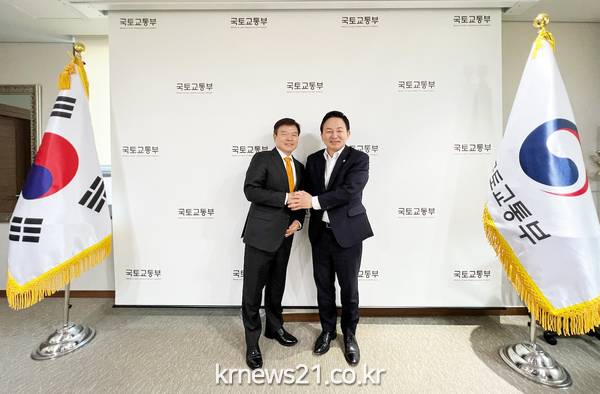 ▲ 사진=이필형 동대문구청장(사진 왼쪽)과 원희룡 국토부장관(사진 오른쪽)이 기념 촬영을 하고 있다.이필형 동대문구청장이 19일 정동국토발전전시관에서 원희룡 국토부장관을 면담하고 스마트시티 조성 등 지역 현안 해결을 위한 지속적인 관심과 정부차원의 적극적인 지원을 요청했다.