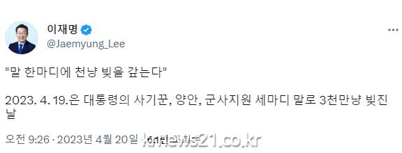 ▲ 사진=이재명 의원 트위터 캡처더불어민주당 이재명 대표가 윤석열 대통령의 4·19 혁명 기념식과 로이터통신 인터뷰 발언을 비판하며 “대통령의 사기꾼, 양안, 군사지원 세 마디에 3천만 냥 빚을 졌다”고 밝혔다.