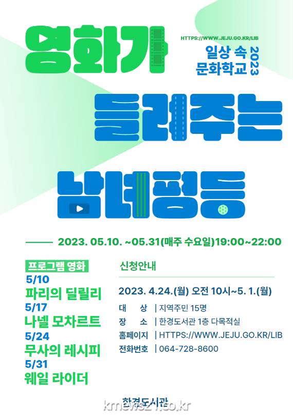 ▲ 사진=제주시한경도서관에서는 5월 가정의 달을 맞이하여「문화와 일상을 잇는 한경도서관 문화학교」의 일환으로 <영화가 들려주는 남녀평등>을 운영한다고 밝혔다.