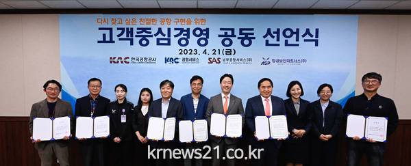 한국공항공사(사장 윤형중)는 21일, 서울 강서구 본사에서 KAC 공항서비스·남부공항서비스·항공보안파트너스 등 3개 자회사와 철저한 고객중심의 사고를 기반으로 공항의 현장 노력을 극대화하기 위한 「고객중심경영」을 선언했다.