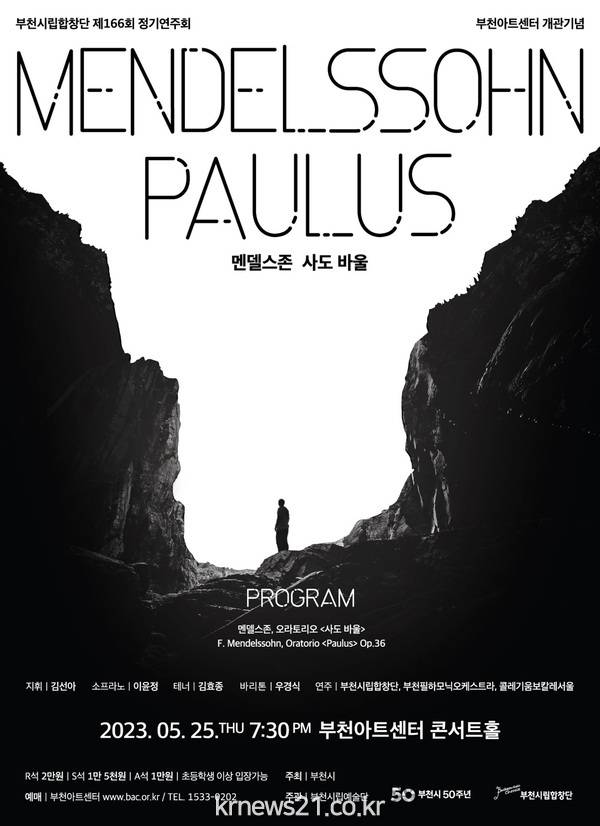 부천시립합창단 김선아 상임지휘자는 “부천아트센터는 높은 층고로 인해 유럽의 성당과 같은 따뜻한 울림을 가지고 있어 합창음악에 매우 적합하다. ‘사도 바울’은 대규모 관현악 서곡, 오페라를 방불케 하는 극적인 아리아와 합창곡이 세련되게 어우러진 작품이기 때문에 이에 더할 나위 없을 것”이라 전했다. 이 공연은 소프라노 이윤정, 테너 김효종, 베이스 우경식, 부천필하모닉오케스트라와 콜레기움 보칼레 서울이 함께 한다.