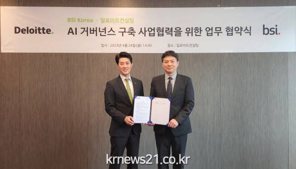 ▲ 사진=BSI글로벌 최대 인증업체 중 하나인 BSI(영국왕립표준협회) 코리아(대표 임성환, 이하 BSI)와 딜로이트 컨설팅 코리아(대표이사 홍진석, 이하 딜로이트 컨설팅)가 4월 24일 서울 여의도 서울국제금융센터 One IFC 빌딩 8층에서 ‘AI 시스템 신뢰 확보와 국제표준(ISO 42001) 인증’ 사업 협력을 위한 전략적 업무협약(MOU)을 체결했다고 25일 밝혔다.