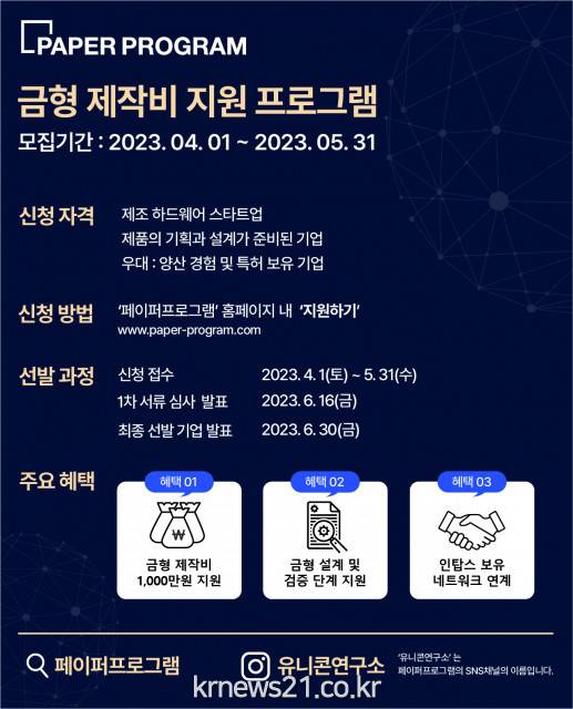 인탑스의 하드웨어 스타트업 지원 사업인 페이퍼프로그램은 2023 상반기에 ‘금형 제작 지원 프로그램’을 진행하고, 유망 스타트업을 발굴해 스타트업이 제품을 성공적으로 출시할 수 있도록 전문 제조 컨설팅과 금형 제작비 1000만원을 지원한다.