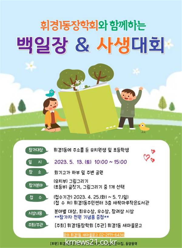 ‘제1회 휘경1동 어린이 백일장 및 사생대회’는 5월 13일(토) 휘경1동 주민센터 앞 회기고가 하부공원과 주변공원에서 펼쳐지며, 대회참가 어린이에게는 장학회 사업비로 원고지⋅도화지⋅기념품⋅간식 등이 제공된다.