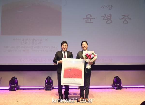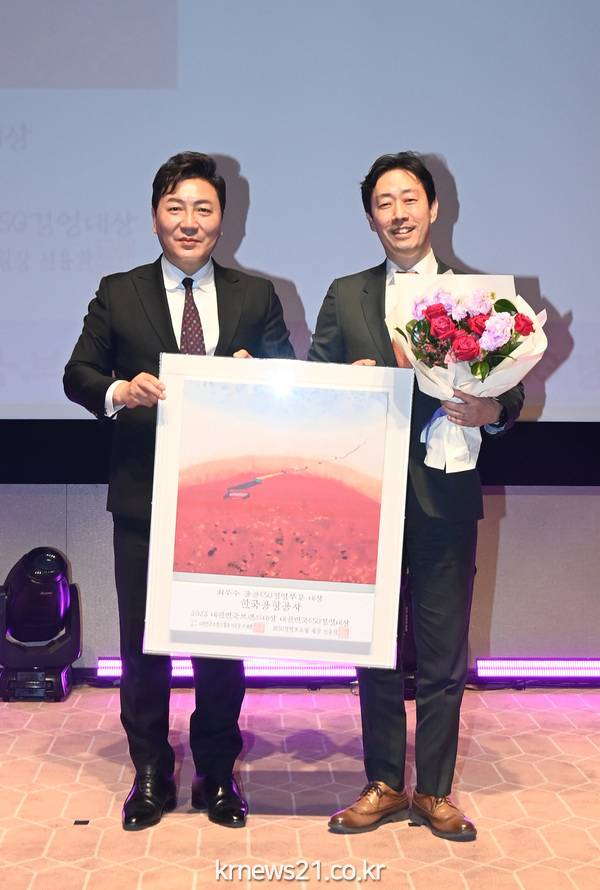 (사진설명) 26일, 여의도 한국거래소 컨퍼런스홀에서 개최된 「2023 대한민국브랜드대상·ESG경영대상」 시상식에서 윤형중 한국공항공사 사장(오른쪽)이 공공ESG경영부문 대상을 수상하고 기념촬영을 하고 있다.