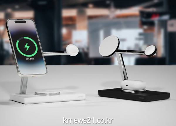 ▲ 사진=아트뮤코리아감성 모바일 충전 액세서리 브랜드 ‘아트뮤(ARTMU)’의 운영사 아트뮤코리아(대표 우석기)가 아이폰·에어팟·애플워치의 동시 충전이 가능한 맥세이프(MagSafe) 인증 3in1 고속무선충전기(모델: MC410)를 출시했다.