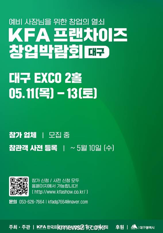 대구광역시와 한국프랜차이즈산업협회 대구경북지회(지회장 김병철)는 오는 5월 11일(목)부터 13일(토)까지 3일간 ‘2023 프랜차이즈 대구 박람회’를 엑스코 2홀에서 개최한다.