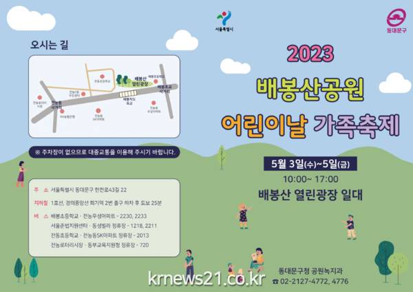 ▲ 사진=‘2023 동대문구 어린이날 가족축제’ 개최 안내동대문구(구청장 이필형)가 제101회 어린이날을 맞아 배봉산 열린광장(한천로43길 22, 배봉산 숲속도서관 앞)일대에서 ‘2023 어린이날 가족축제’를 개최한다.
