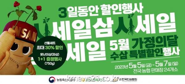 한국인삼협회(회장 반상배)는 농협경제지주, 인삼자조금관리위원회와 함께 5월 5일부터 7일까지 3일간 ‘2023 5월 가정의 달 수삼 최대 반값 할인행사’를 개최한다.
