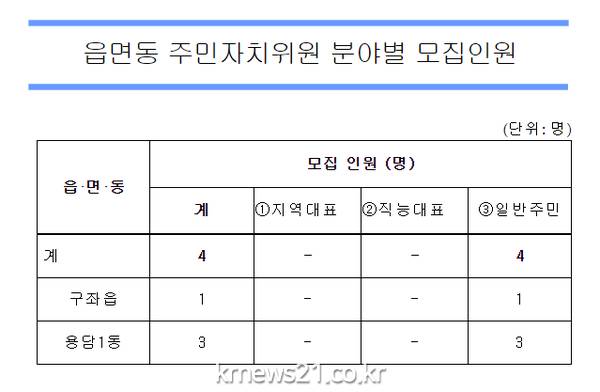 자격요건은 공고일 현재 만 19세 이상의 해당 읍‧면‧동 주민으로 주민자치학교 교육(4시간)을 이수한 시민이면 누구나 지원 가능하며, 접수는 해당 읍‧면 사무소 및 동 주민센터로 방문하여 신청하면 된다.