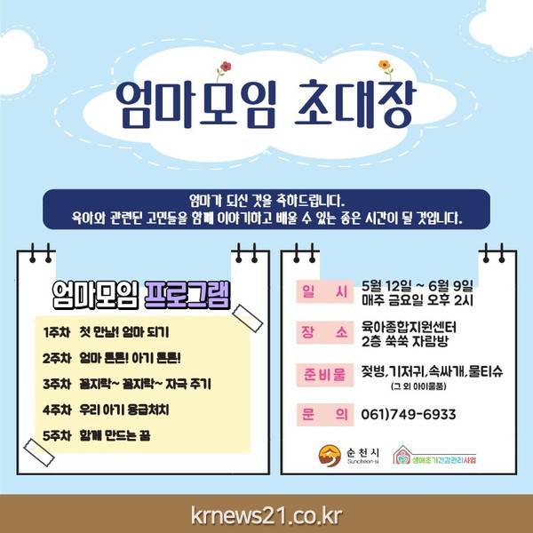 순천시(시장 노관규)는 오는 12일부터 6월 9일까지 생애초기 건강관리사업 방문가정 7가구를 대상으로 육아 역량 강화를 위한 ‘엄마모임’을 운영한다.