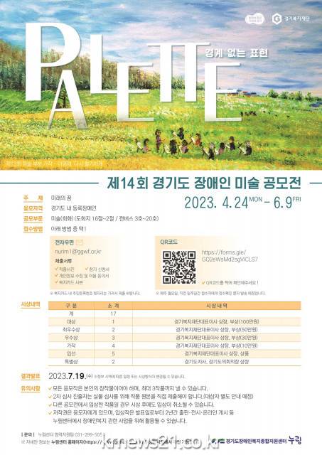 누림센터는 공모전을 통해 경기도 내 장애인들의 예술 활동 기회 확대와 신예 작가 발굴을 위해 노력하고 있으며, 장애와 비장애의 경계 없는 표현을 추구하는 제14회 경기도 장애인 미술 공모전에 많은 관심과 참여를 부탁드린다고 밝혔다.