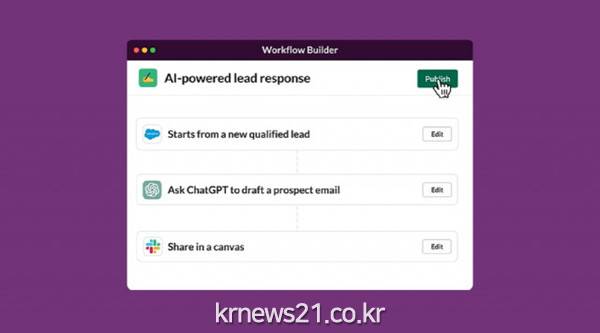 · 슬랙, 대형언어모델 및 소프트웨어 툴 생태계를 효율적으로 자동화하는 노코드(no-code) 워크플로우를 생성한다. 슬랙의 워크플로 빌더(Workflow Builder) 기능으로 생성형 AI 앱을 워크플로우에 즉시 연결할 수 있다.