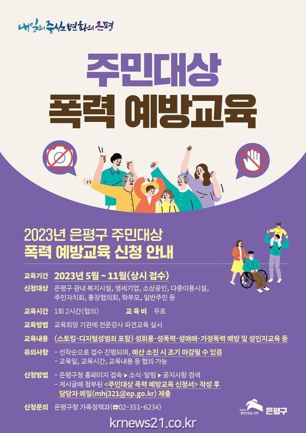 ▲ 사진=주민대상 폭력 예방교육 안내 포스터서울 은평구(구청장 김미경)는 지역사회 성평등 의식 개선과 공감대 형성으로 안전한 은평 구현을 위한 주민대상 폭력 예방교육을 실시한다.