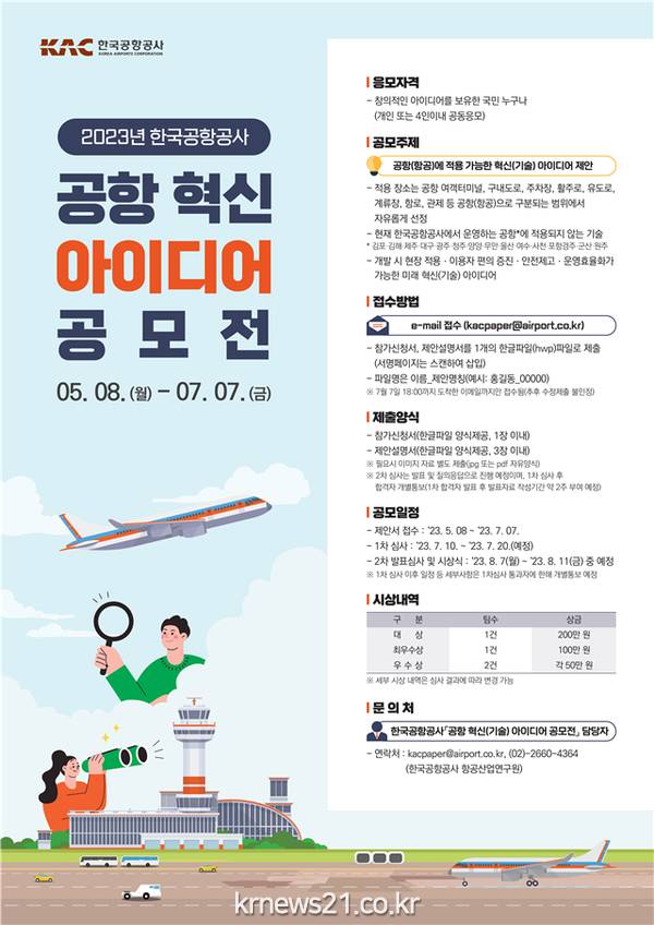공항·항공분야에 관심이 있거나 창의적인 아이디어를 보유한 국민 누구나 참여할 수 있으며, 참가 신청서와 제안설명서를 이메일(kacpaper@airport.co.kr)로 제출하면 된다.