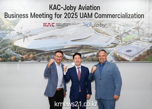 윤형중 한국공항공사 사장(중앙), 그렉 볼스 조비 대정부 협력분야 총괄임원(오른쪽), 에릭 앨리슨 조비 서비스 분야 총괄임원(왼쪽)이 기념촬영을 하고 있다.