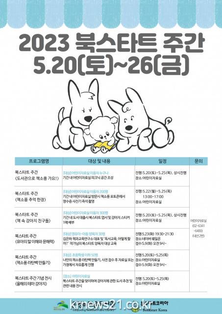 북스타트 주간은 한국 북스타트 20주년을 맞아 책읽는사회문화재단·문화체육관광부·한국출판문화산업진흥원이 함께 개최하는 행사다. 5월 20일(토)부터 26일(금)까지 운영한다. 이번 행사는 슬로건 ‘도서관으로 책소풍 가요!’와 ‘강아지’를 주제로 다양한 프로그램이 진행된다.