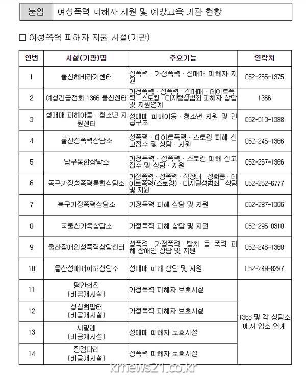 울산시는 여성 폭력 예방 및 피해자 지원을 위해 해바라기센터, 여성긴급전화 1366 울산센터, 성매매 피해아동·청소년 지원센터 등 14개소의 상담소 및 보호시설 등을 운영 중이며, 5대 폭력에 대한 일반시민들의 인식 개선을 위해 다양한 폭력예방 교육 사업 등을 추진 중이다.