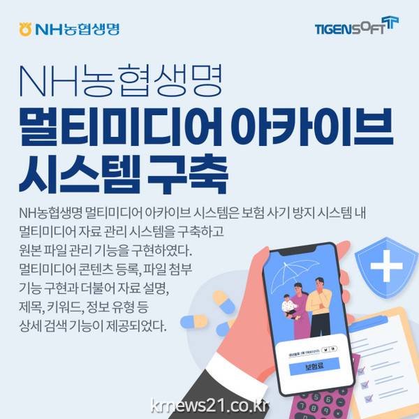 티젠소프트는 이번 멀티미디어 아카이브 시스템(TG 1st MCMS Archive) 구축 사업을 통해 NH농협생명의 보험 사기 방지 시스템 내에 멀티미디어 자료 관리 시스템을 구축하고, 데이터베이스 관리 시스템을 제공해 원본 파일 관리 기능을 구현했다.