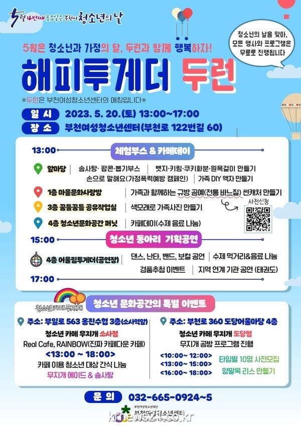 ○ 부천여성청소년재단(대표이사 양선희)이 운영하는 부천여성청소년센터(센터장 김수경)에서는 5월 20일(토) 1시 센터 앞마당에서 청소년의 날을 맞아 ‘해피투게더 두런’행사를 진행한다.