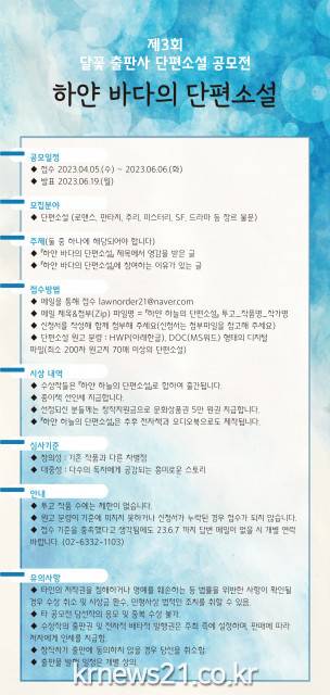 ▲ 사진=로앤오더로앤오더 출판사의 문학 부문 브랜드 달꽃 출판사가 제1회 단편소설 공모전 ‘붉은 달의 단편소설’, 제2회 단편소설 공모전 ‘분홍 하늘의 단편소설’에 이어 제3회 단편소설 공모전 ‘하얀 바다의 단편소설’의 공모를 추진한다.