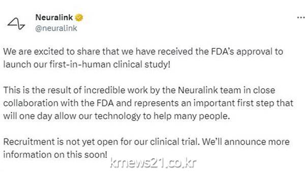 뉴럴링크는 현지 시각 25일 트위터를 통해 “인간을 대상으로 처음 임상 연구를 시작하기 위한 미국식품의약국(FDA)의 승인을 받았다는 소식을 전하게 돼 기쁘다”고 밝혔다.