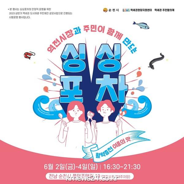 순천시(시장 노관규)는 역세권 도시재생사업의 일환으로 다음달 2일부터 4일, 3일간 <싱싱포차 : 활력충전, 여름의 맛> 행사를 역세권 도시재생 주민제안 공모사업의 일환으로 진행한다.