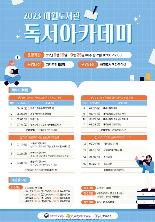 ▲ 사진=제주시제주시 애월도서관은 문화체육관광부가 주최하고 한국출판문화산업진흥원이 주관하는 공모사업에 「2023 독서아카데미」사업이 선정되어 참여자를 모집한다고 밝혔다.