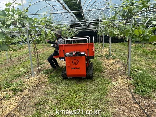 ▲ 사진=한 농가에서 용인특례시가 대여한 동력운반차를 이용해 작물을 관리하고 있다본격적인 농번기를 맞아 용인특례시 농기계 임대사업이 농가의 부족한 일손을 거드는 데 한몫하며 인기를 끌고 있다.