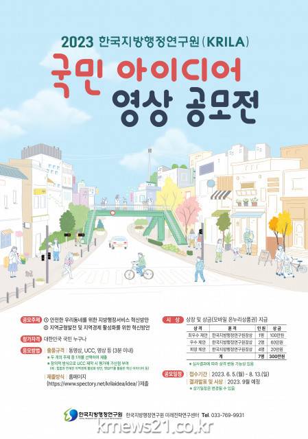 ▲ 사진=한국지방행정연구원한국지방행정연구원(원장 김일재)은 6월 5일(월) 국민이 제시한 문제 해결형 아이디어를 발굴하고, 지방자치단체 혁신에 대한 국민적 관심 유도하고자 ‘2023년 국민 아이디어 영상 공모전’을 개최한다고 밝혔다.