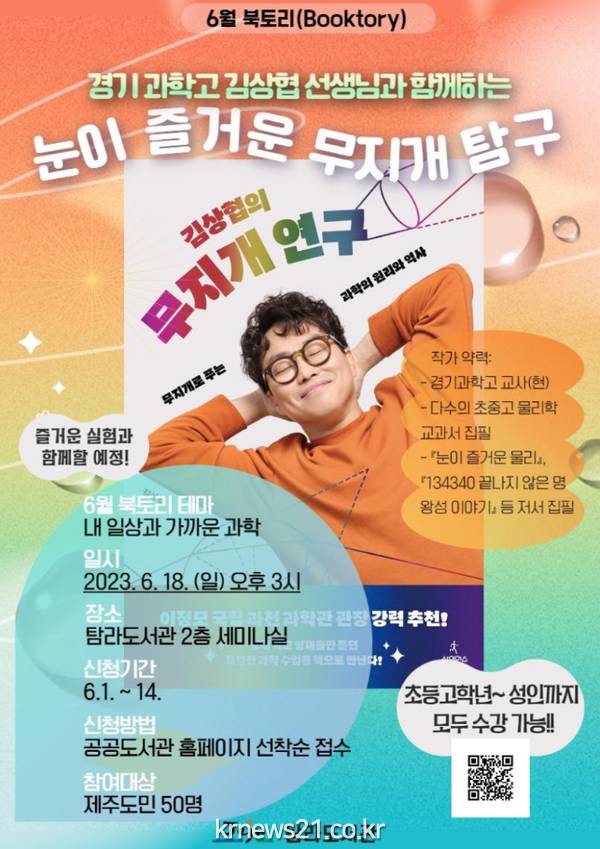 ▲ 사진=제주시제주시 탐라도서관은 6월 18일(일) 오후 3시 ‘눈이 즐거운 무지개 탐구’라는 주제로 김상협 작가의 강연을 개최한다고 밝혔다.