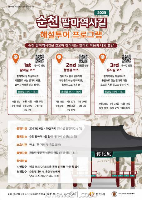 ‘2023년 순천 팔마역사길 해설투어 프로그램’은 10월 말까지 진행되며, 신청 링크를 통해 프로그램 사전 접수가 가능하다. 현장 접수도 프로그램 운영일 11시부터 2시까지 순천 팔마비 앞에서 진행한다. 보다 자세한 사항은 PAL문화유산센터 담당자에게 문의하면 된다.