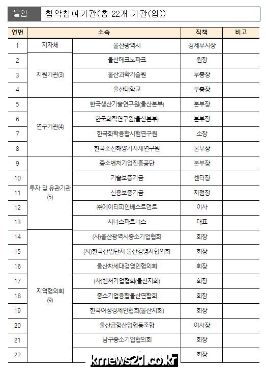 이날 협약식은 울산시, 우수기술 지원기관(3개), 지역 소재 정부출연 연구기관(4개), 투자 및 유관기관(5개), 지역기업 협의회(9개) 등 총 22개 기관 관계자를 포함한 주요 관계자 200여 명이 참석한 가운데 진행된다.