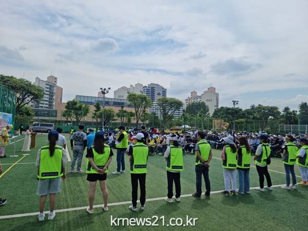 ▲ 사진=행사장에 도열하고 있는 봉사단개막식 전에는 주차관리 및 발달장애인 선수단 안내, 선수단 기념품(가죽 글러브와 유니폼)을 전달하는데 지원을 하고 질서지도를 지원하였다.