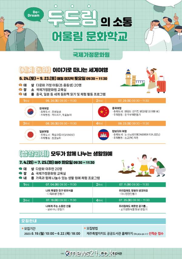 신청기간은 6월 19일(월) 오전 10시부터 22일까지이며, 제주특별자치도 공공도서관 홈페이지(http://www.jeju.go.kr/lib)를 통해 선착순으로 접수한다.