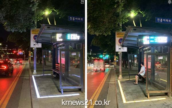 어두운 밤 버스를 기다리는 승객의 안전은 물론 운전자의 시야 확보를 위한 특별한 조명이 있어 눈길을 끈다.