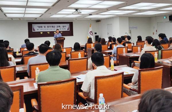 ▲ 사진=최홍연 동대문구 부구청장이 21일 청렴교육을 진행하고 있다. 동대문구(구청장 이필형)가 직무 전문성 향상과 투명한 행정 구현을 위해 21일 오후 구청 5층 기획 상황실에서 공사, 용역 업무 담당 직원 43명을 대상으로 원가계산 실무 및 청렴교육을 실시했다.