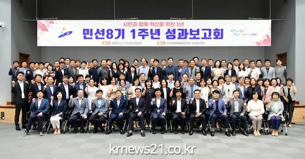 ▲ 안산시, 민선8기 출범 1주년 성과보고회 개최안산시(시장 이민근)는 안산문화예술의전당 국제회의장에서 이민근 시장, 김대순 부시장을 비롯한 5급 이상 간부공무원 130여 명이 참석한 가운데 ‘민선8기 안산시 1주년 성과보고회’를 개최했다고 23일 밝혔다.