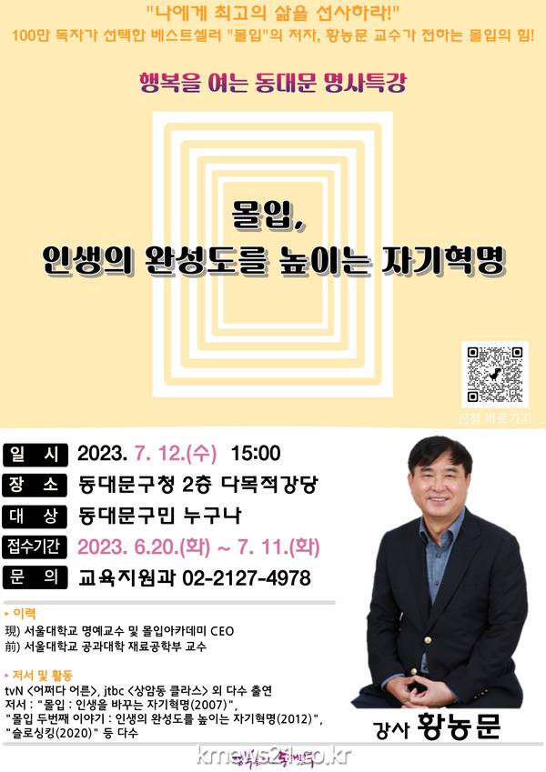 ▲ 사진=베스트셀러 ‘몰입’의 저자 황농문 서울대 명에교수 초청 강연 안내동대문구(구청장 이필형)는 7월 12일(수) 오후 3시 동대문구청 2층 다목적 강당에서 황농문 서울대학교 명예교수를 초청해『몰입, 인생의 완성도를 높이는 자기혁명』을 주제로 ‘동대문 명사특강’을 진행한다.