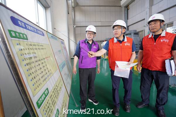 ▲ 사진=25일 오전 이필형 동대문구청장(사진 왼쪽)이 용두1 토출수문을 점검하고 있다이필형 동대문구청장이 본격적으로 장마가 시작되는 25일 오전 관내 빗물펌프장 및 수문 등 6개소를 점검했다.