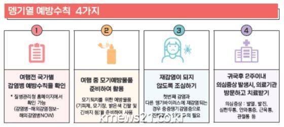 여주시보건소장은 “동남아시아 등 해외여행을 계획하고 있는 국민들에게 안전하고 즐거운 여행이 될 수 있도록 여행 전 뎅기열 예방수칙을 숙지하고, 여행 후 뎅기열 감염이 의심된다면 검역소에서 신속진단검사를 받을 것”을 당부하였다.