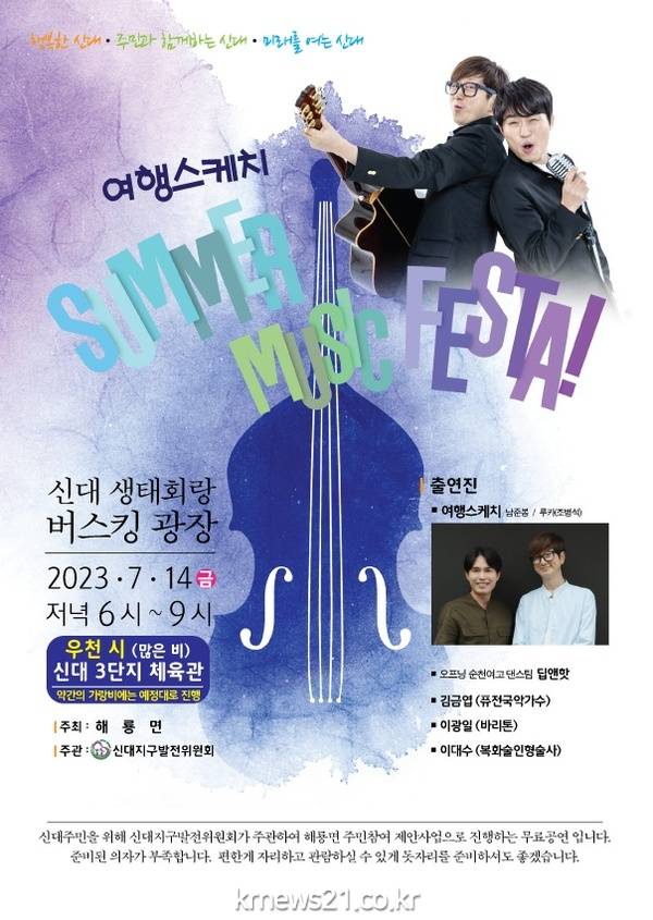 순천시 해룡면이 주최하고 신대지구 발전위원회가 주관하여 개최하는 신대 생태회랑 힐링 버스킹 공연이 오는 14일 생태회랑 버스킹 공연장에서 오후 6시부터 9시까지 개최된다.