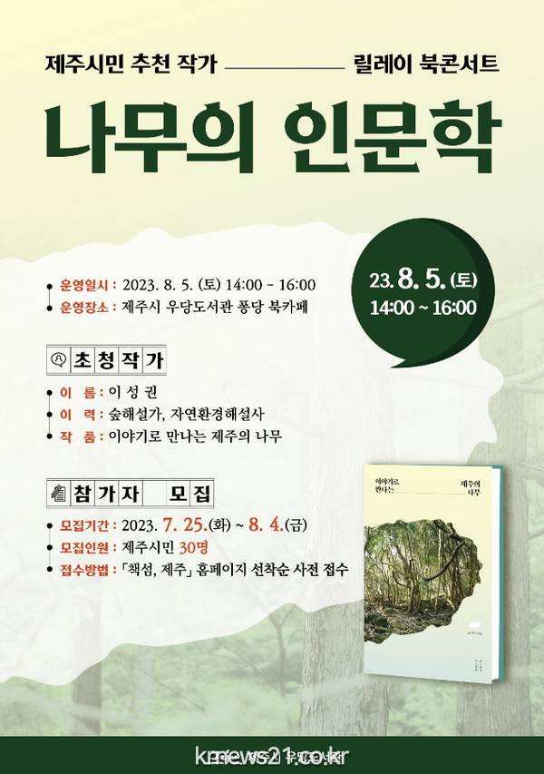 ▲ 사진=제주시제주시 우당도서관은 8월 5일(토) 이성권 작가의‘나무의 인문학’을 주제로 북콘서트를 운영한다.