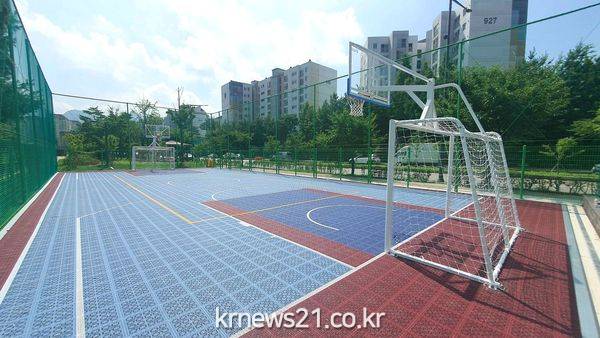 농구와 풋살 모두 즐길 수 있는 다목적 골대, 비 온 뒤에도 바로 사용할 수 있는 플라스틱 바닥재, 조명시설 등 쾌적한 체육 환경이 갖춰졌다.