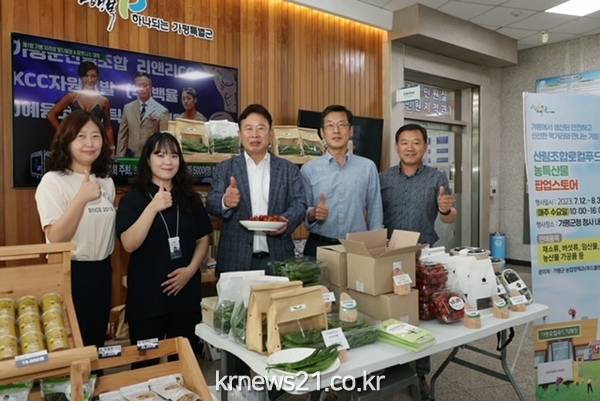 ▲ 가평군 농·특산물 반짝매장 운영, 8월 말까지가평군이 지역생산 농산물을 지역에서 소비하는 선순환체계를 구축해 안전한 먹거리를 제공하고 지속가능한 농업추진에 나서고 있는 가운데 군청 내에 직거래 장터를 마련해 호응을 얻고 있다.