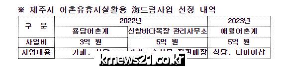 한편 제주시는 지난해 용담어촌계(3억 원)와 신창바다목장 관리사무소(5억 원)에 이어 올해 애월어촌계(5억 원)까지 총 3개소가 선정되어 현재 사업 추진 중이다.
